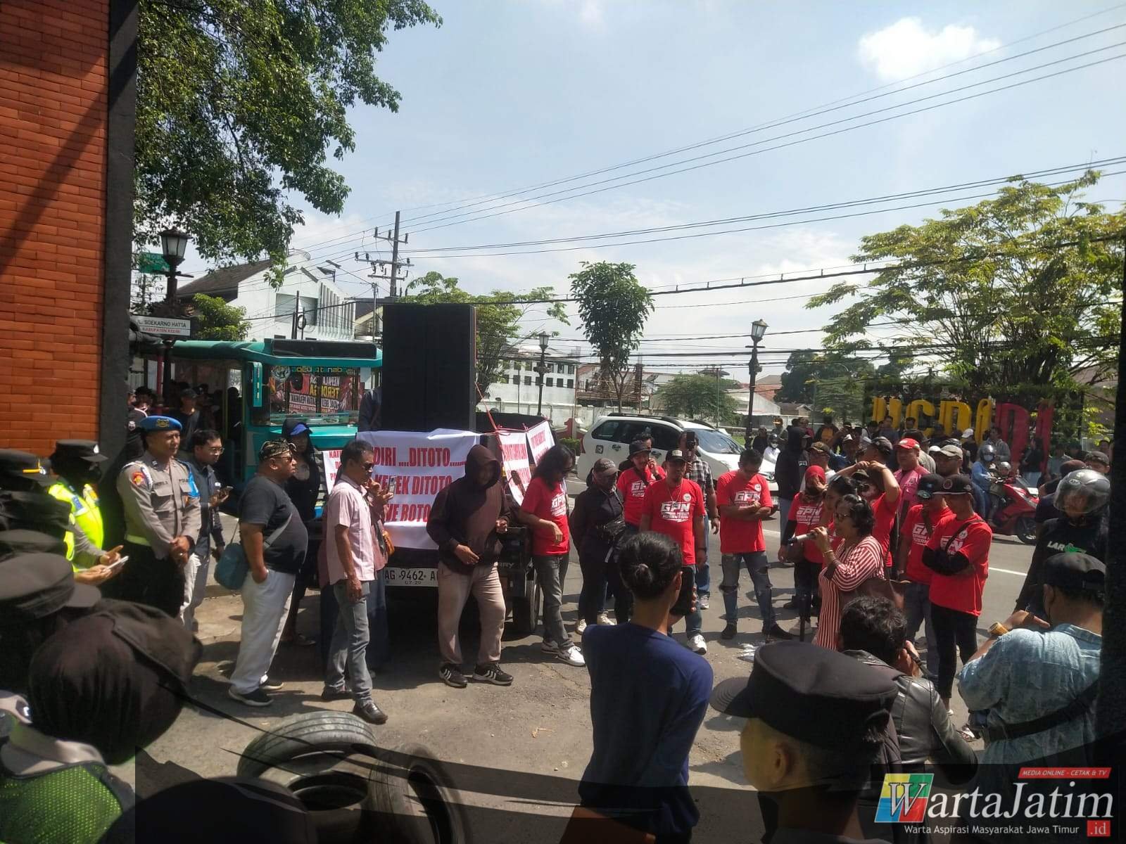 Aksi sempat diwarnai pembakaran ban sebagai simbol protes, namun secara umum berlangsung tertib dengan pengawalan aparat kepolisian dan Satpol PP Kabupaten Kediri.