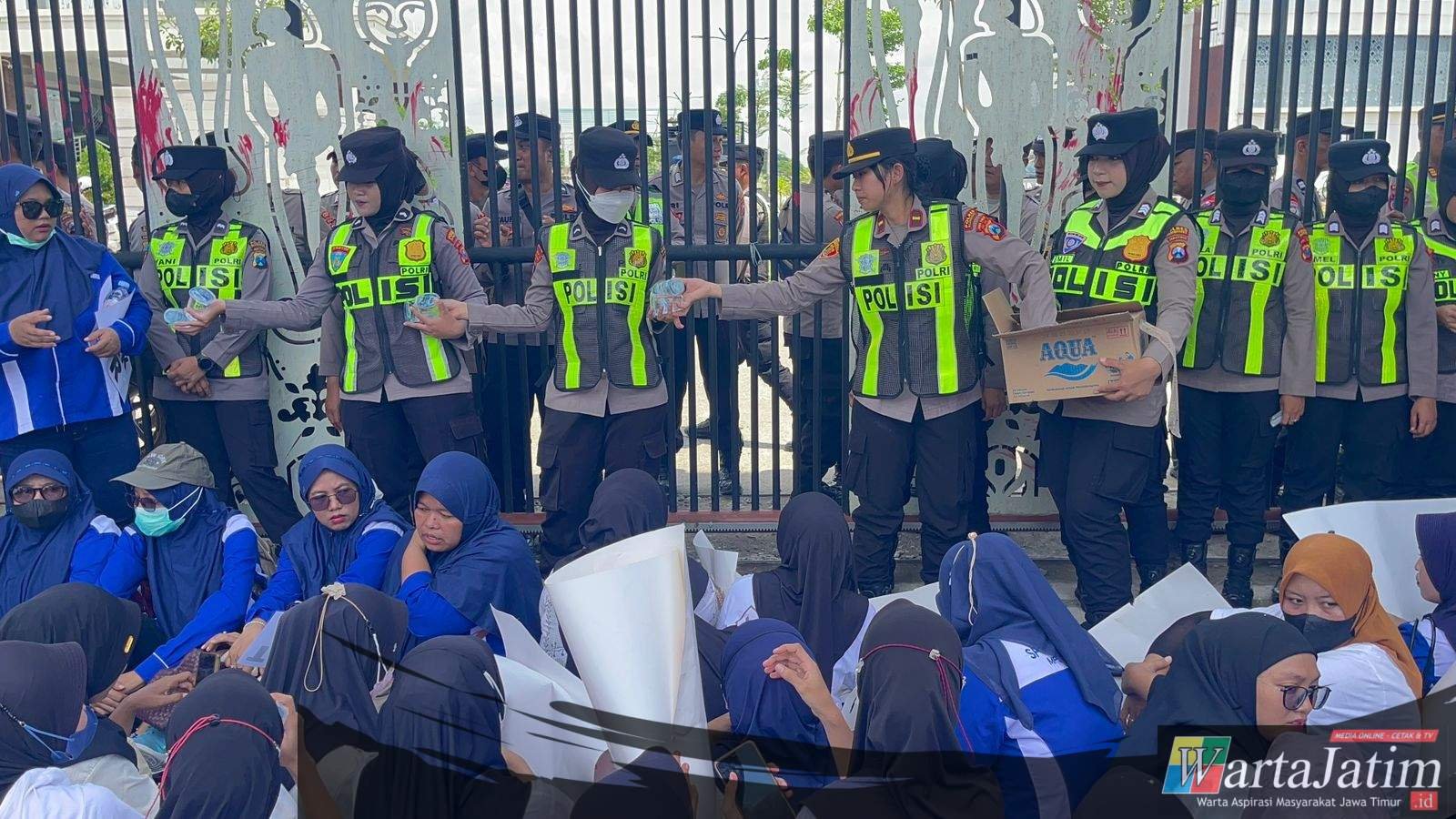 Di tengah kerumunan massa yang menyuarakan aspirasi mereka, tampak sejumlah Polisi Wanita (Polwan) dari Polres Bojonegoro Polda Jatim melakukan aksi simpatik dengan membagikan air mineral kepada para pengunjuk rasa.