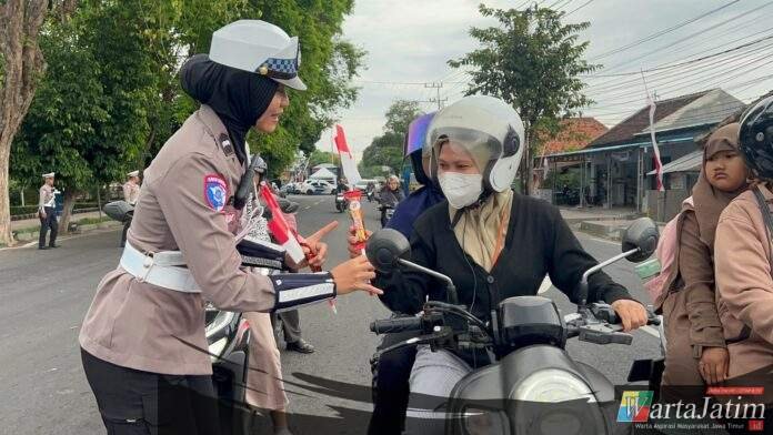 BANYUWANGI – Wartajatim.id || Seluruh anggota Polisi Wanita (Polwan) Polresta Banyuwangi Polda Jawa Timur menggelar kegiatan simpatik dengan membagikan cokelat kepada para pengguna jalan di Simpang Empat Patung Kuda, Banyuwangi, Selasa (26/8).