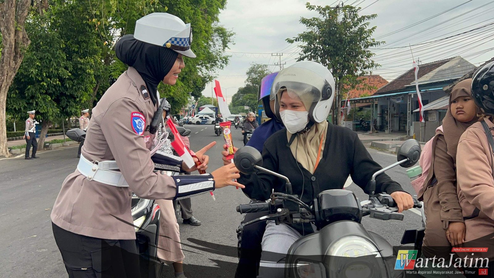 Selain membagikan cokelat dan bendera, para Polwan juga menyampaikan imbauan terkait keselamatan berlalu lintas.