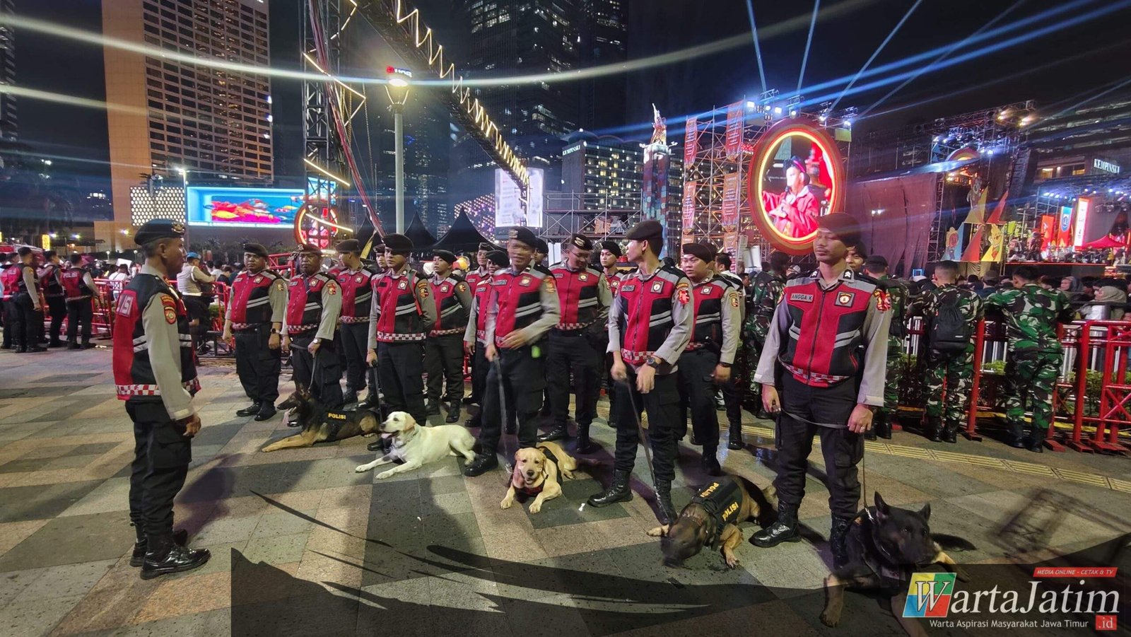 Jakarta — Wartajatim.id || Korps Sabhara mengerahkan satuan K-9 untuk memperkuat pengamanan malam pergantian Tahun Baru di kawasan Bundaran Hotel Indonesia, Rabu (31/12/2025) malam. Pengamanan dilakukan guna memastikan situasi tetap aman dan kondusif di tengah tingginya aktivitas masyarakat.
