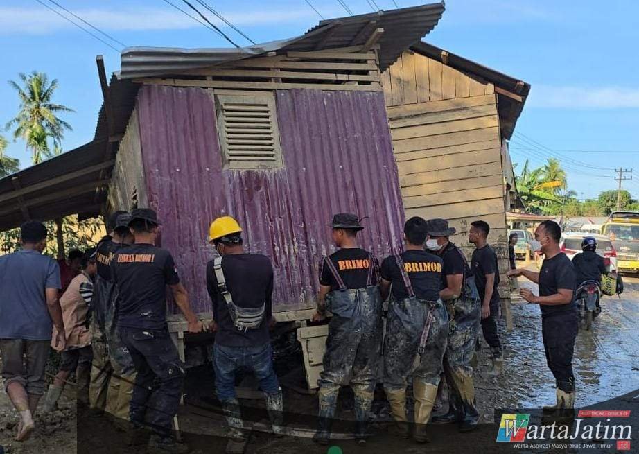 Kuala Simpang — Wartajatim.id || Personel Brimob Polda Aceh bergerak cepat memindahkan sebuah rumah warga yang terseret banjir bandang hingga melintang di badan Jalan Nasional Langsa —Tamiang. Upaya ini dilakukan untuk memastikan akses lalu lintas kembali terbuka sehingga distribusi bantuan bagi masyarakat terdampak tidak mengalami hambatan.