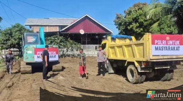 Pidie – Wartajatim.id || Personel Polres Pidie bersama warga masyarakat melaksanakan kegiatan pembersihan lumpur pasca bencana banjir di Gampong Tanjong, Kecamatan Kembang Tanjong, Kabupaten Pidie. Kegiatan tersebut dilakukan di sejumlah titik terdampak, antara lain halaman Meunasah Gampong Tanjong, lingkungan Kantor Keuchik, penanganan abrasi pada tanggul Sungai Krueng Tiro, serta pembersihan lumpur di Tempat Pemakaman Umum (TPU) Gampong Tanjong.