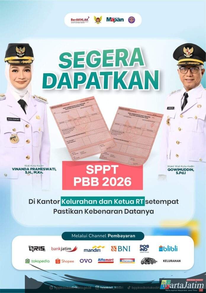 KEDIRI KOTA – Wartajatim.id || Pemerintah Kota (Pemkot) Kediri melalui Badan Pengelola Pendapatan, Keuangan, dan Aset Daerah (BPPKAD) menyampaikan Surat Pemberitahuan Pajak Terutang Pajak Bumi dan Bangunan (SPPT PBB) tahun 2026,Jumat (27/2/2026).
