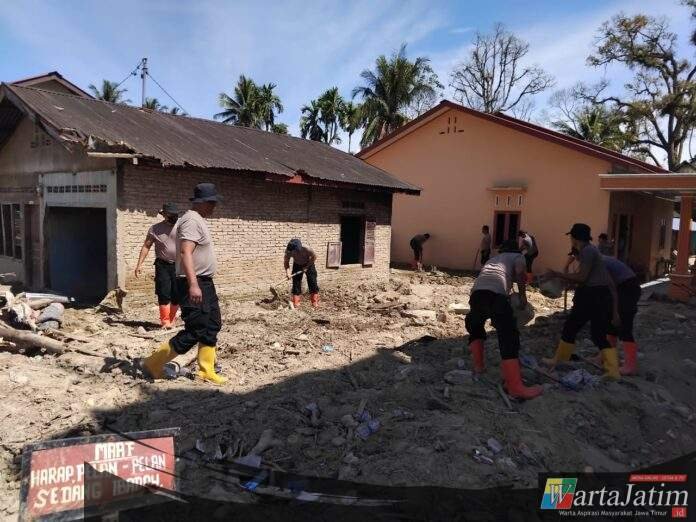 Tapanuli Selatan — Wartajatim.id || Personel Batalyon C Satuan Brimob Polda Sumatera Utara terus melanjutkan upaya pemulihan pascabencana banjir bandang di Kecamatan Batang Toru, Kabupaten Tapanuli Selatan. Pada Kamis pagi (15/1/2026), personel Brimob kembali diterjunkan untuk melakukan pembersihan rumah warga yang terdampak material pasir, kayu, dan batu, sekaligus pembangunan fasilitas MCK di rumah ibadah.