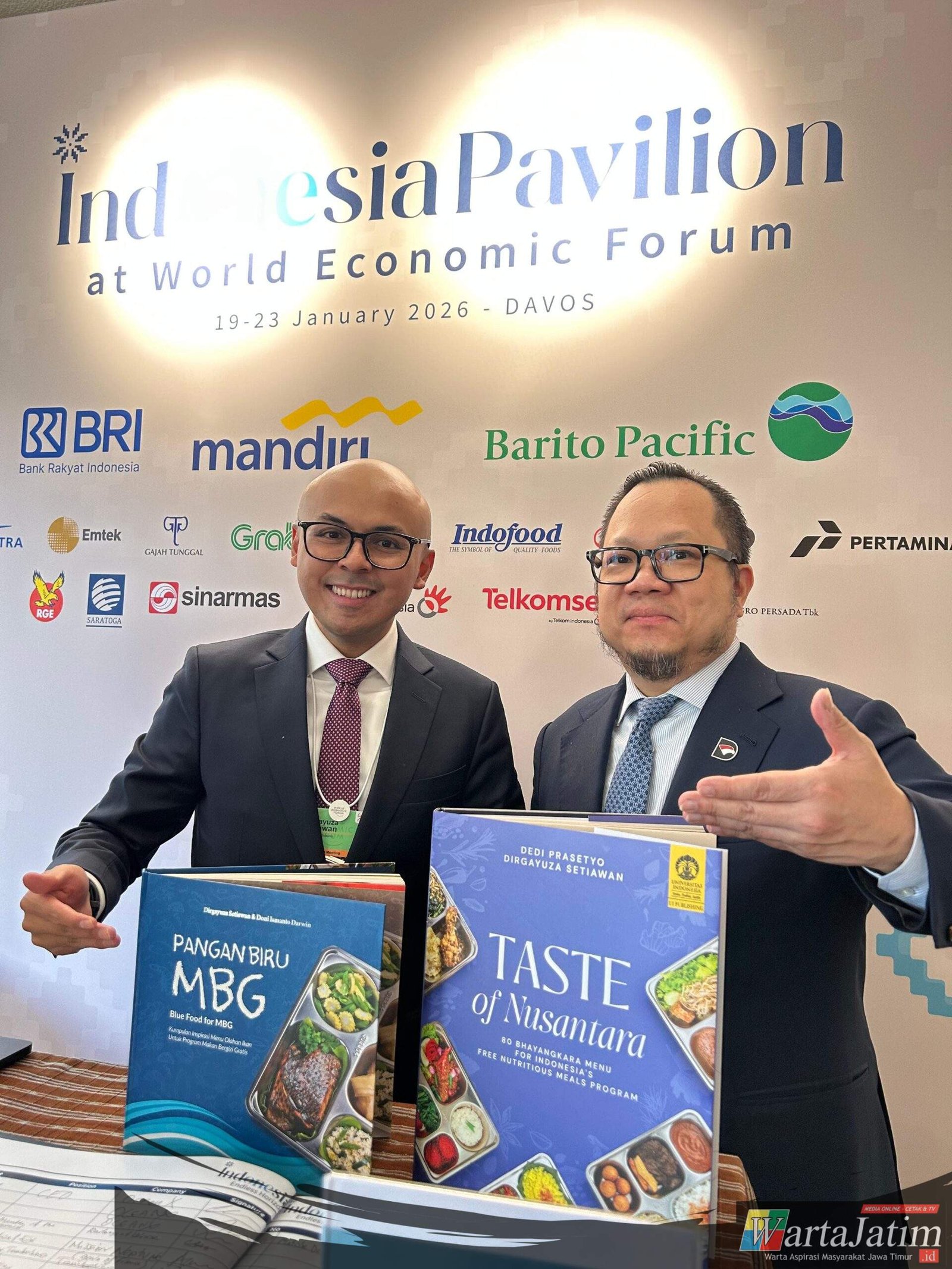 “Saya menyerahkan buku Rasa Bhayangkara Nusantara versi Bahasa Inggris kepada Bapak Stefanus Ade Hadiwidjaja, Managing Director, Investment, Danantara Indonesia, untuk ditampilkan di Paviliun Indonesia pada WEF Davos 2026 sebagai bagian dari showcase diplomasi MBG dan khazanah rasa Nusantara,” ujar Dirgayuza Setiawan.