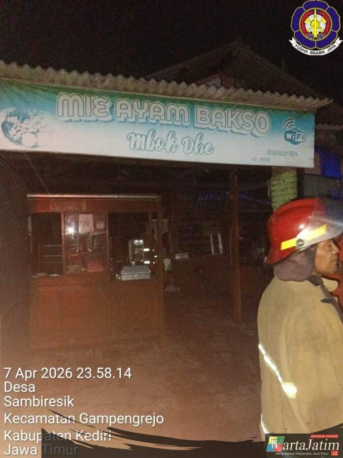 Kediri – Wartajatim.id || Dapur Rumah milik Roim, warga Dusun Centongan, Desa Sambiresik,RT. 08 / RW. 01, Kecamatan Gampengrejo, Kabupaten Kediri, ludes dilalap si jago merah sekitar pukul 23.57 WIB, Rabu (8/4/2026) jelang tengah malam.