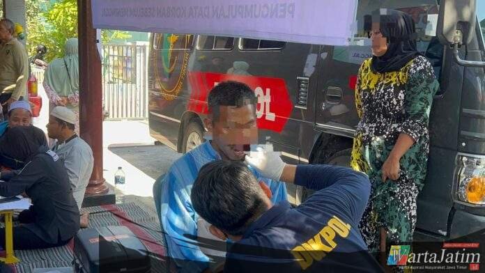 SIDOARJO – Wartajatim.id || Bidang Kedokteran dan Kesehatan (Biddokkes) Polda Jatim, mulai melakukan pengumpulan sampel DNA dari keluarga korban yang masih belum ditemukan di dalam reruntuhan bangunan Pondok Pesantren Al Khoziny, Buduran, Sidoarjo, Kamis (2/10/2025) pagi.