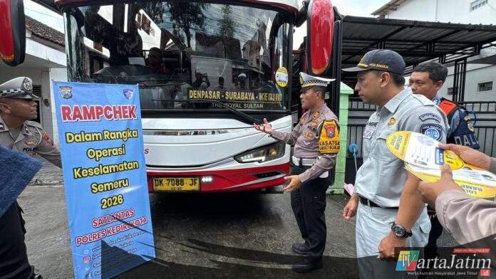 Kediri Kota – Wartajatim.id || Satuan Lalu Lintas Polres Kediri Kota bersama instansi terkait melaksanakan kegiatan rampcheck kendaraan angkutan umum di Terminal Tamanan, Kecamatan Mojoroto, Kota Kediri, pada Jumat (6/2/2026) pagi. Kegiatan ini dilaksanakan dalam rangka mendukung pelaksanaan Operasi Lilin Semeru 2025 guna memastikan keselamatan dan kelayakan angkutan umum.