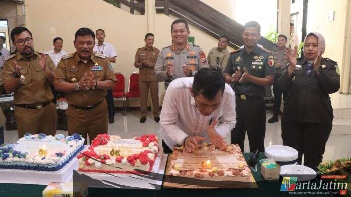 Nganjuk – Wartajatim.id || Kapolres Nganjuk AKBP Henri Noveri Santoso, S.H., S.I.K., M.M., bersama Forkopimda dan Ketua DPRD Kabupaten Nganjuk memberikan kejutan ulang tahun ke-56 kepada Ketua Pengadilan Negeri (PN) Nganjuk, Jamuji, S.H., M.H. Perayaan sederhana ini diwarnai kebersamaan dengan menyantap tumpeng yang dibawa masing-masing pimpinan lembaga, Senin (11/8/2025).
