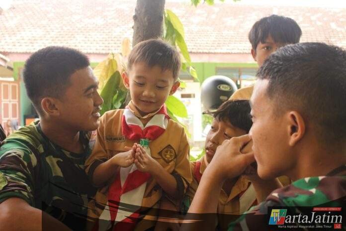 Di balik seragam loreng yang dikenakan, para prajurit tampak membaur tanpa sekat bersama siswa Madrasah Ibtidaiyah (MI) setempat.