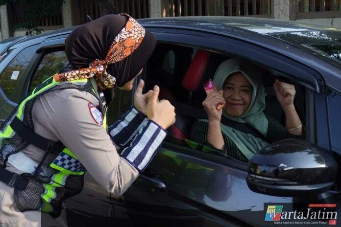 Kediri – Wartajatim.id || Arus lalu lintas di simpang empat Masjid An-Nur Pare, Kabupaten Kediri pada Selasa (21/4/2026) sore, diwarnai kehadiran jajaran Satlantas Polres Kediri yang menggelar kegiatan ‘Srikandi Lantas Menyapa’ bertepatan dengan peringatan Hari Kartini.