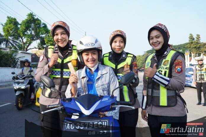 Kediri – Wartajatim.id || Arus lalu lintas di simpang empat Masjid An-Nur Pare, Kabupaten Kediri pada Selasa (21/4/2026) sore, diwarnai kehadiran jajaran Satlantas Polres Kediri yang menggelar kegiatan ‘Srikandi Lantas Menyapa’ bertepatan dengan peringatan Hari Kartini.