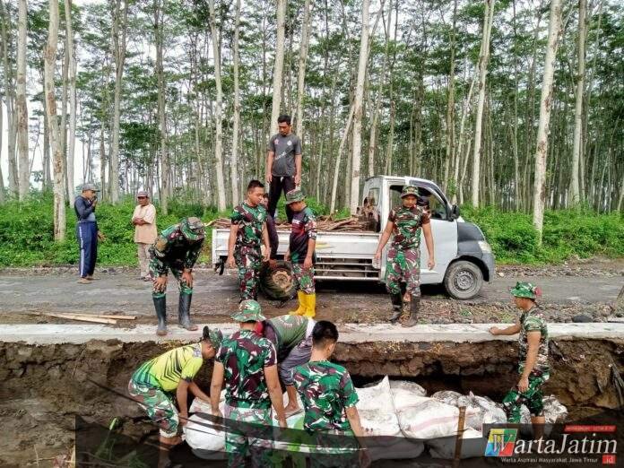 Personel Satuan Setingkat Kompi (SSK) Satgas TMMD dari Brigif 16/Wira Yudha bersama masyarakat tampak bergotong royong membersihkan material yang terbawa aliran air hujan agar akses jalan kembali dapat digunakan warga.