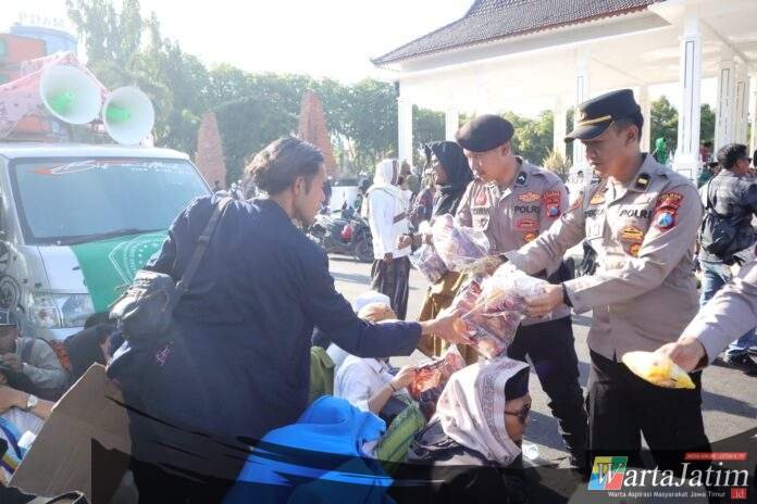 Dalam aksi yang digelar di depan Pendopo Kabupaten Situbondo itu, Polres Situbondo Polda Jawa Timur menunjukkan pendekatan humanis dengan membagikan roti dan air mineral kepada para peserta aksi.