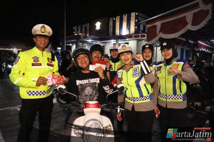 Kediri Kota – Wartajatim.id || Satuan Lalu Lintas (Satlantas) Polres Kediri Kota membagikan bendera merah putih ke pengendara pada Sabtu (9/8/2025) malam. Aksi bagi-bagi bendera merah putih yang digelar di depan Mako Satlantas Polres Kediri Kota ini untuk menyambut Hari Ulang Tahun (HUT) Republik Indonesia ke-80.