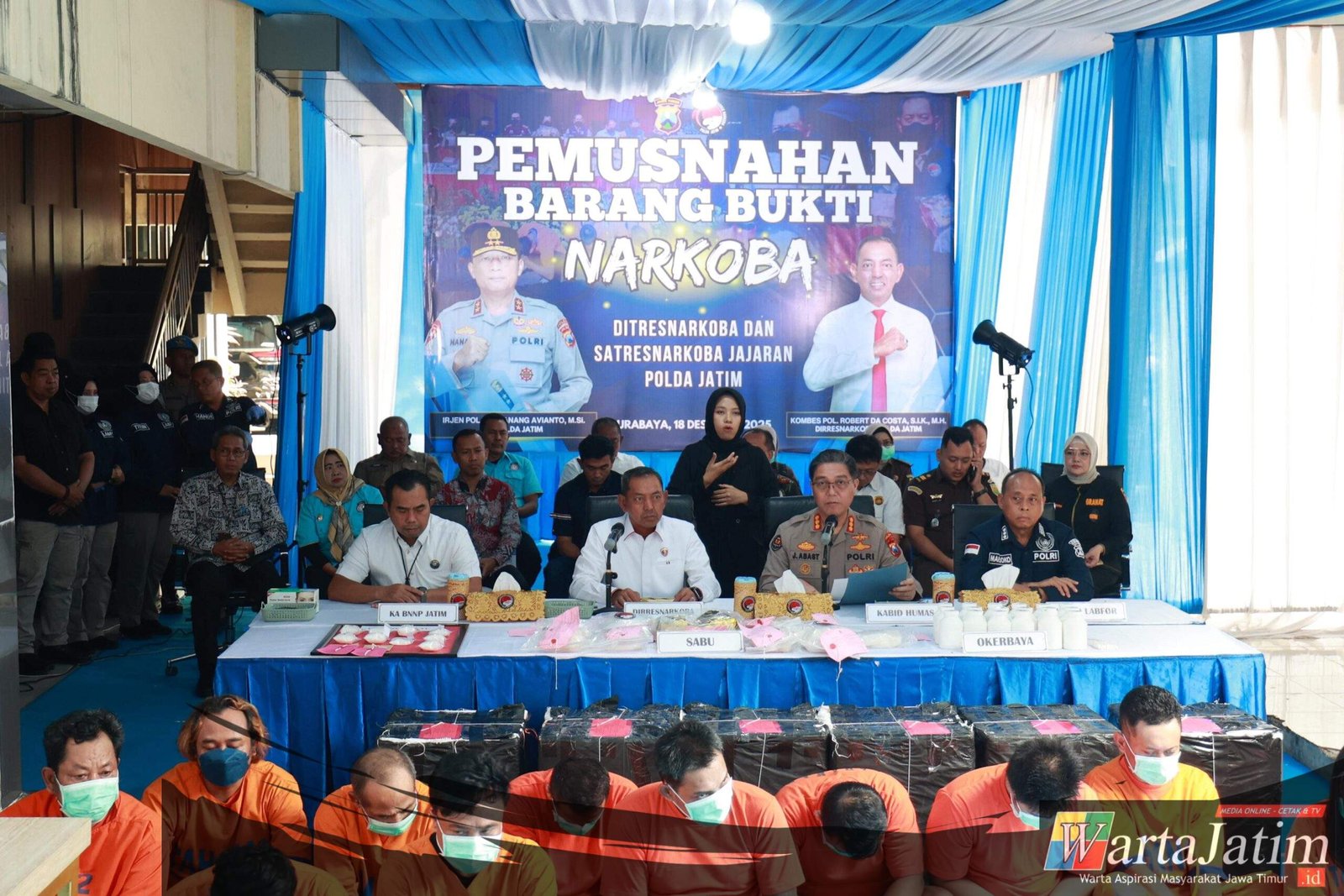 Pada Juni 2025, Polda Jatim memusnahkan 49 kg sabu dan 2.860 butir ekstasi, serta 5.688.600 butir obat keras.