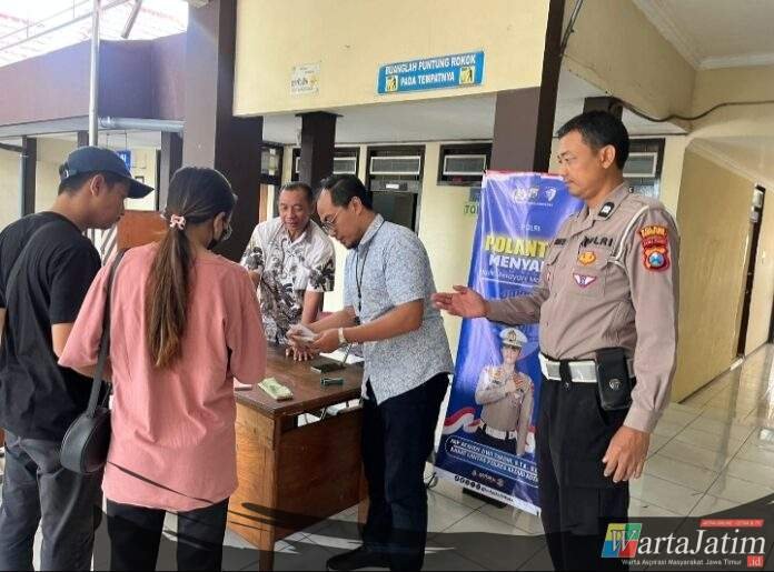 KEDIRI KOTA – Wartajatim.id || Melalui Program inovatif bertajuk “Polantas Menyapa” yang selama ini sudah di gaungkan Satuan Lalu Lintas (Satlantas) Polres Kediri Kota, program yang di nilai ramah dan efektif ini hingga saat ini masih terus dilakukan dalam upaya meningkatkan transparansi pelayanan pada publik dan untuk mempererat kedekatan antara pihak kepolisian dan masyarakat yakni wajib pajak ( WP).