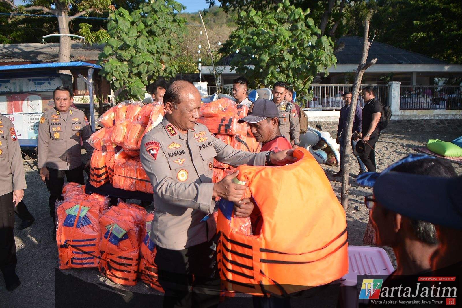 Kapolda Jatim juga memberikan rompi pelampung untuk keamanan serta bingkisan sembako untuk para nelayan.