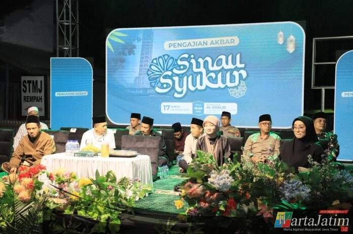 Kediri Kota – Wartajatim.id || ASuasana religius dan penuh kehangatan tampak mewarnai kegiatan Pengajian Akbar yang digelar di Masjid Al Khalid, Kecamatan Kota, Kota Kediri pada Jumat (17/10/2025) malam. Kegiatan yang menghadirkan KH. Agus Anang Darunnajah (Gus Anang) ini mengusung tema “Sinau Syukur” dan dihadiri sekitar 300 jamaah dari berbagai lapisan masyarakat.