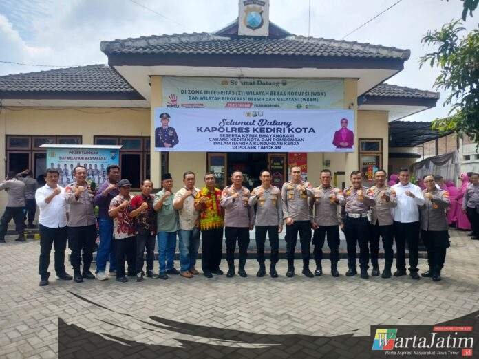 Kediri Kota – Wartajatim.id || Kapolres Kediri Kota AKBP Anggi Saputra Ibrahim, S.H., S.I.K., M.H., didampingi Ketua Bhayangkari Cabang Kediri Kota Ny. Yani Anggi pada Kamis (11/12/2025) melaksanakan rangkaian kunjungan kerja ke tiga Polsek jajaran, yakni Polsek Tarokan, Polsek Grogol, dan Polsek Banyakan. Kunjungan ini menjadi bagian dari program kerja Kapolres dalam memastikan kesiapan personel, kondisi Mako, serta pembinaan internal menjelang perayaan Natal dan Tahun Baru.