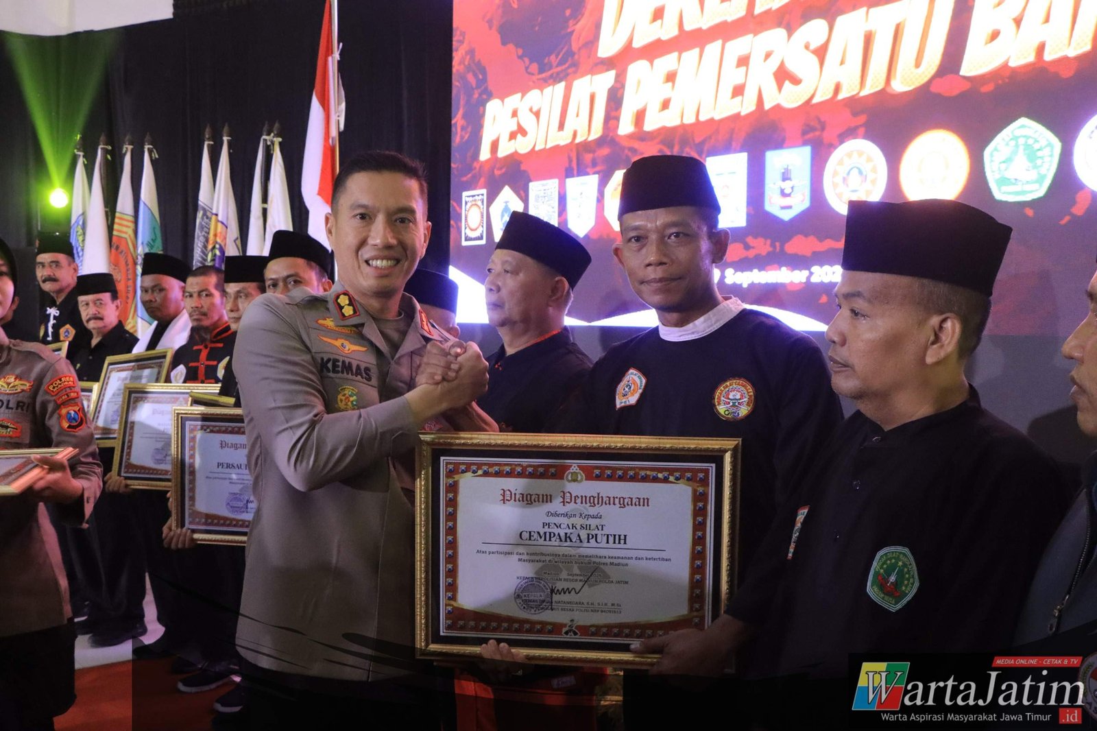 “Penghargaan ini adalah bukti bahwa kami dari kepolisian memberikan apresiasi setinggi-tingginya kepada perguruan silat yang telah berperan aktif dalam menjaga kondusifitas,” kata AKBP Kemas.