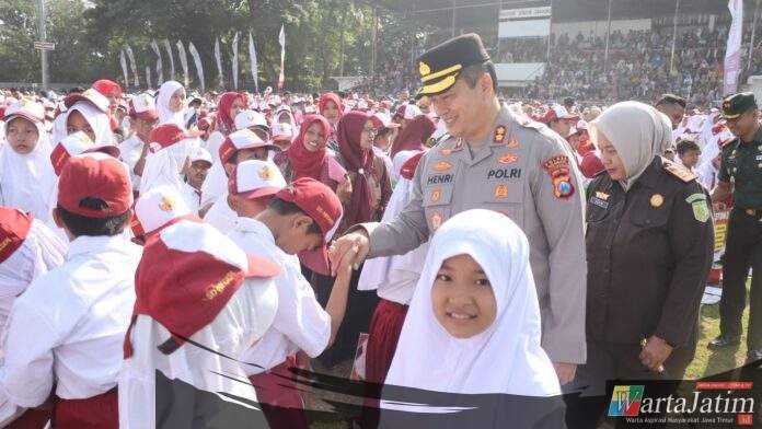 Nganjuk – Wartajatim.id || Ribuan pelajar SD hingga SMP di Kabupaten Nganjuk menerima beasiswa Kartu Nganjuk Cerdas (KNC) dalam apel akbar bertajuk Nganjuk Melesat Cerdas Berprestasi Tahun 2025 di Stadion Anjuk Ladang, Senin (29/9/2025). Sebanyak hampir 10 ribu pelajar mendapatkan beasiswa dengan nominal mulai Rp600 ribu hingga Rp1 juta.