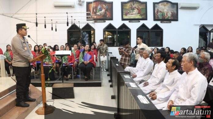 Nganjuk – Wartajatim.id || Di sela rangkaian pengamanan Operasi Lilin Semeru 2025, Kapolres Nganjuk AKBP Henri Noveri Santoso, S.H., S.I.K., M.M didampingi Wakapolres dan pejabat utama Polres Nganjuk menyambangi sejumlah gereja untuk menyampaikan ucapan selamat Natal kepada umat Kristiani, Rabu malam (24/12/2025).