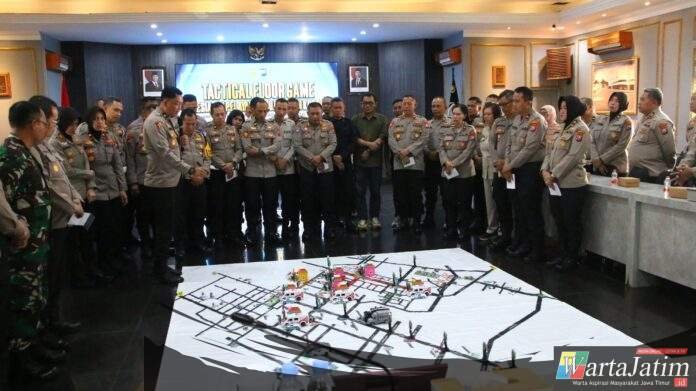 Pada H-1 kegiatan Mujahadah Kubro 1 Abad NU, Kapolresta Malang Kota, Kombes Pol Putu Kholis Aryana didampingi Kabag Ops Kompol Wiwin Rusli memimpin Tactical Floor Game (TFG) di Ballroom Sanika Satyawada, Jumat (06/02/2026).
