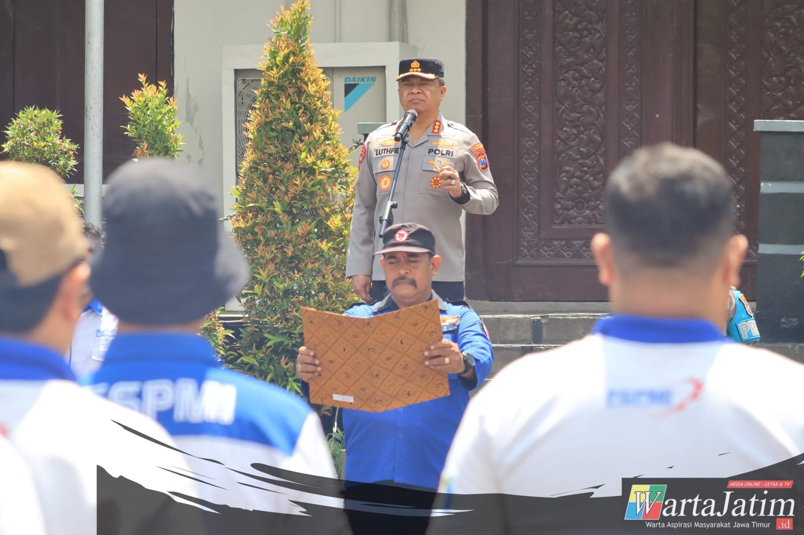 SURABAYA — Wartajatim.id || Kapolrestabes Surabaya, Kombes Pol Luthfi Sulistiawan memimpin Apel Kebangsaan di lapangan A Mapolrestabes Surabaya bersama perwakilan serikat pekerja dari berbagai elemen di Surabaya.