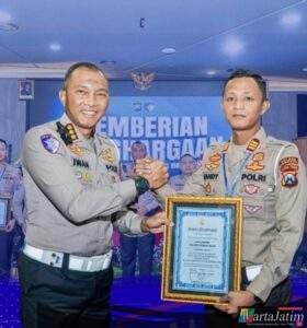 Piagam penghargaan tersebut diserahkan langsung oleh Dirlantas Polda Jatim dan diterima oleh Kasat Lantas Polres Kediri Kota, AKP Afandy Dwi Takdir, S.T.K., S.I.K., dalam sebuah seremoni yang dihadiri para pejabat utama Ditlantas Polda Jatim dan perwakilan Polres se-Jawa Timur, Kamis (31/7/2025).