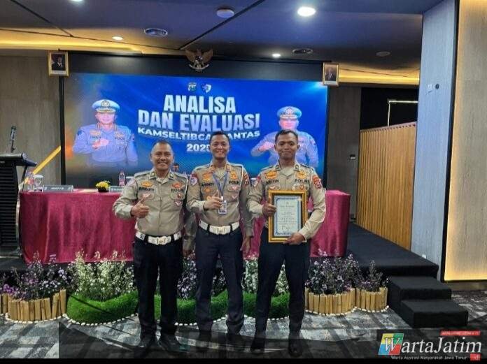 Kediri Kota – Wartajatim.id || Satuan Lalu Lintas (Satlantas) Polres Kediri Kota kembali menorehkan prestasi membanggakan dalam bidang lalu lintas. Dalam kegiatan Analisa dan Evaluasi (Anev) Kamseltibcar Lantas Tahun 2025 yang diselenggarakan oleh Direktorat Lalu Lintas Polda Jawa Timur, Satlantas Polres Kediri Kota menerima penghargaan atas capaian penegakan pelanggaran lalu lintas (Dakgar Lantas) tertinggi se-jajaran Polres Tipe D dalam rangka Operasi Patuh Semeru 2025.