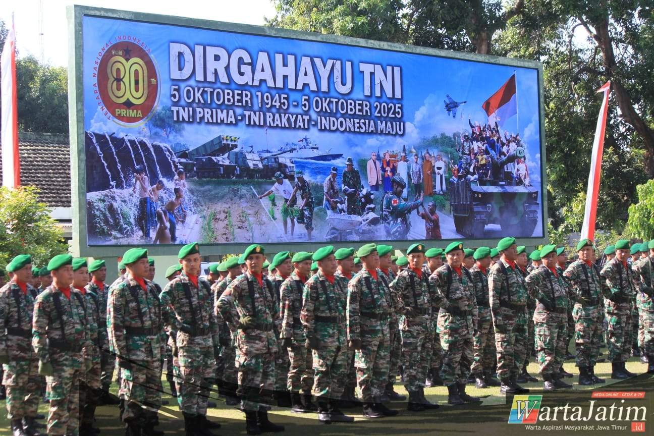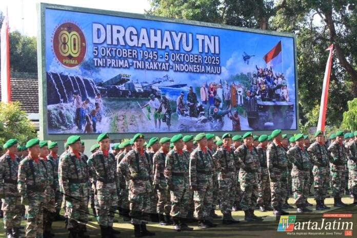 KEDIRI – Wartajatim.id || Kodim 0809/Kediri bersama Jajaran TNI di wilayah Kediri menggelar Upacara peringatan Hari Ulang Tahun (HUT) Ke – 80 Tentara Nasional Indonesia tahun 2025 yang digelar di Lapangan Upacara Markas Kodim 0809/Kediri Jl. A. Yani No. 16 Kel. Banjaran Kec/Kota Kediri. Minggu, (5/10/202).