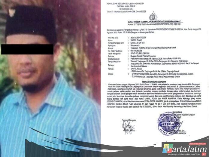 Kasus dugaan pencurian ini pun telah dilaporkan ke Sentra Pelayanan Kepolisian Terpadu (SPKT) Polres Gresik pada Senin 18 Agustus 2025 oleh korbannya bernama Saiful Fuad (48 tahun). Laporan diterima oleh petugas piket SPKT Polres Gresik, Aiptu Ahmad Yani, teregister nomor LPM/710.Satreskrim/VIII/2025/SPKT/POLRES Gresik, pada Senin 18 Agustus 2025.