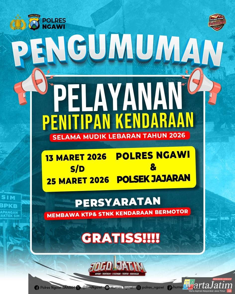 “Masyarakat yang akan mudik dapat menitipkan kendaraan bermotor di Polres Ngawi maupun Polsek jajaran. Layanan ini kami sediakan untuk membantu masyarakat agar mudik lebih aman dan nyaman,” ujarnya, Minggu (15/3/2026)