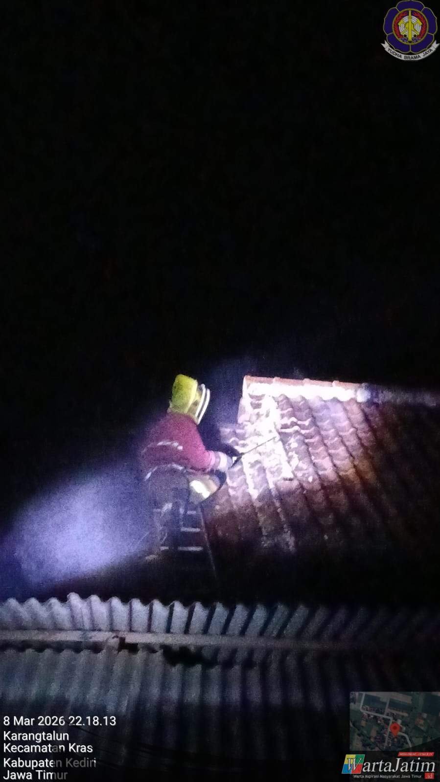 Kediri – Wartajatim.id || Petugas Pemadam Kebakaran (Damkar) Kabupaten Kediri Pos Ngadiluwih evakuasi sarang tawon jenis Vespa yang berada di di atap rumah milik Saudara Rofiq warga RT.05 / RW.04 Dusun Kembang Sore, Desa Karang Talun, Kecamatan Kras, Kabupaten Kediri,pada Minggu(8/3/2026) malam.