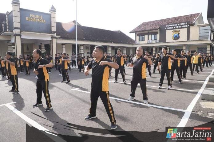 Kediri Kota – Wartajatim.id || Dalam rangka menjaga kebugaran dan meningkatkan kesehatan jasmani, setiap hari Jumat secara rutin Polres Kediri Kota melaksanakan kegiatan olahraga bersama. Kegiatan tersebut diawali dengan apel pagi dan dilanjutkan dengan senam aerobik yang diikuti oleh Pejabat Utama (PJU) serta seluruh anggota Polres Kediri Kota.
