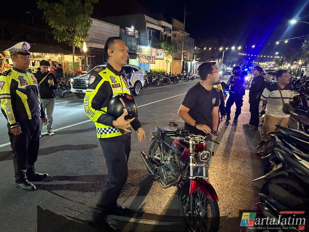 Kegiatan yang dimulai pukul 21.00 WIB ini dipimpin Kasat Lantas Polres Nganjuk AKP Ivan Danara Oktavian, S.Tr.K., S.I.K., M.H., dan turut dihadiri Wakil Bupati Nganjuk Trihandy Cahyo Saputro, S.T.