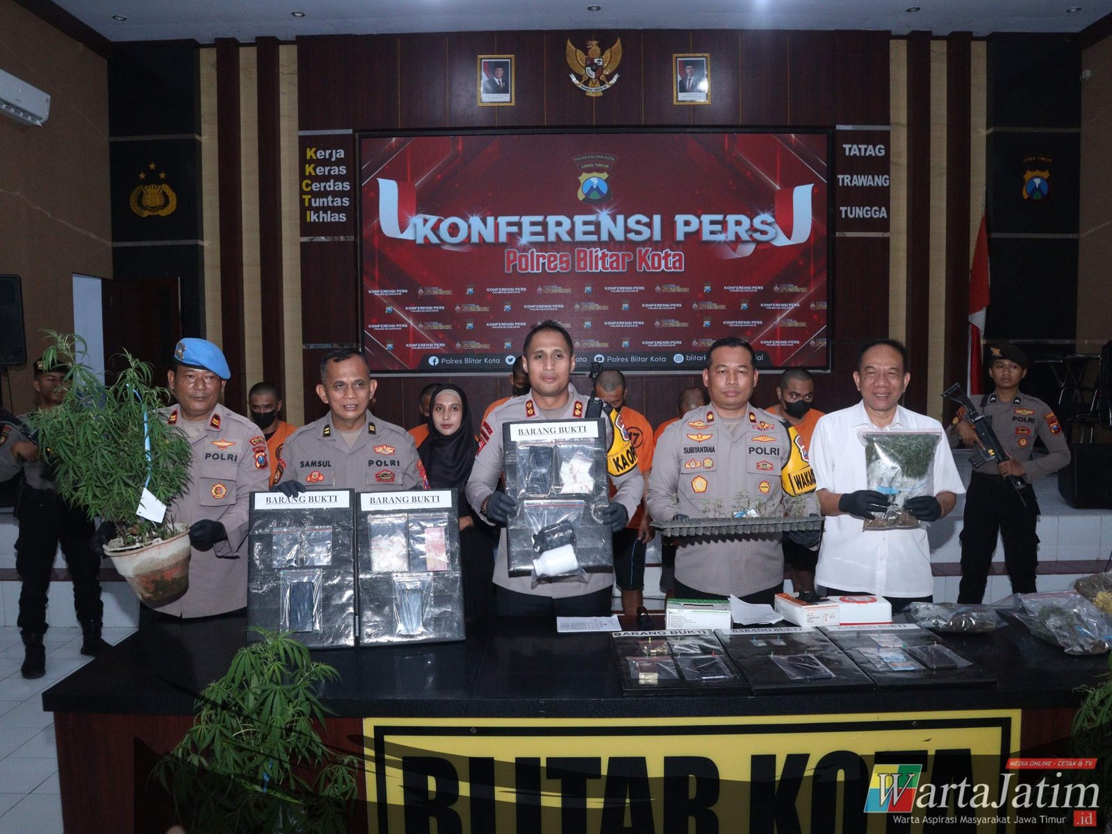 Kapolres Blitar Kota, AKBP Titus Yudho Uly dalam konferensi, pers Rabu (10/09/2025) mengatakan dari hasil operasi itu, Polisi berhasil amankan barang bukti sebanyak 2,46 gram sabu-sabu, 0,75 gram ganja kering,1.403 pil dobel L dan 820 tanaman ganja yang ditanam.
