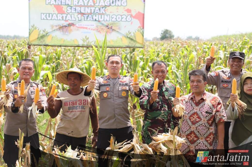 Kediri Kota – Wartajatim.id || Jajaran Polda Jawa Timur bersama Kapolri melaksanakan Panen Raya Jagung Serentak Kuartal I Tahun 2026 yang digelar secara nasional melalui Zoom Meeting, Kamis (8/1/2026). Di wilayah Kabupaten Kediri, kegiatan dipusatkan di lahan pertanian jagung yang berlokasi di Jl. Sawah Kendit, Dusun/Desa Sendang, Kecamatan Banyakan.