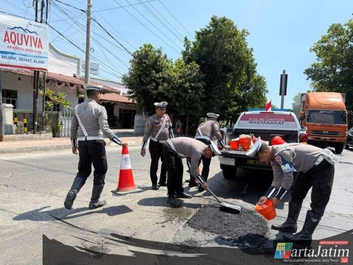 SITUBONDO – Wartajatim.id || Satuan Lalu Lintas (Satlantas) Polres Situbondo Polda Jatim melaksanakan penambalan jalan berlubang di Simpang Empat Pos KTL Barat, Jalan Raya PB. Sudirman, Kecamatan Situbondo Kota, Selasa (12/8/2025)
