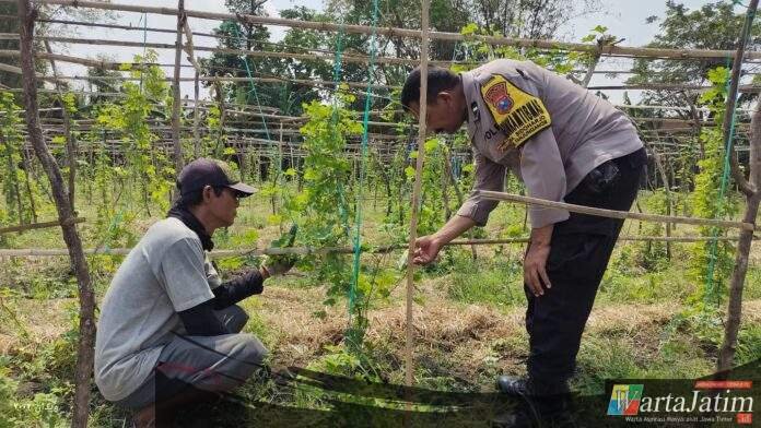 Nganjuk – Wartajatim.id || Dalam rangka mendukung program ketahanan pangan dan pemanfaatan lahan pekarangan, Bhabinkamtibmas Desa Sidoharjo AIPDA Sugeng melaksanakan pemantauan perkembangan tanaman pare milik warga di Desa Sidoharjo, Kecamatan Tanjunganom, Sabtu (16/8/2025).