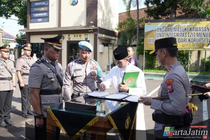 Kapolres Kediri Kota AKBP Anggi Saputra Ibrahim S.H., S.I.K., M.H. memimpin langsung upacara serah terima jabatan yang turut dihadiri PJU Polres Kediri Kota, Kapolsek jajaran, dan anggota Polres Kediri Kota.