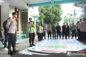 Kabag Ops Polres Kediri Kota Kompol Iwan Setyo Budhi, S.H. juga memberikan paparan melalui Tactical Floor Game (TFG) terkait skema pengamanan serta pembagian tugas personel di setiap titik pengamanan, mulai dari pintu masuk stadion hingga area luar stadion.