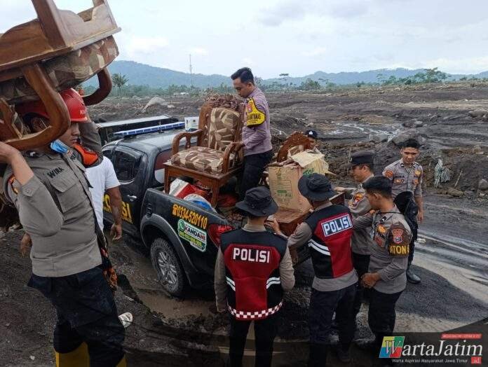 LUMAJANG – Wartajatim.id || Personel Polda Jawa Timur bersama Polres Lumajang turun langsung membantu proses evakuasi barang-barang berharga milik warga di Dusun Sumbersari, Desa Supiturang, wilayah yang terdampak erupsi Gunung Semeru, Minggu (23/11/2025).