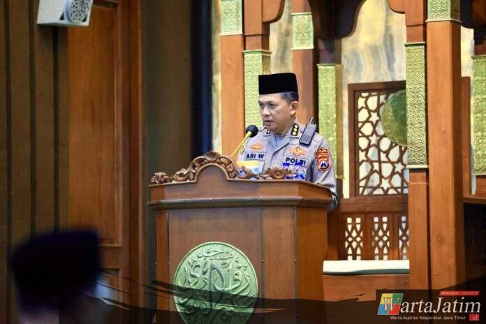 Kepala Biro SDM Polda Jatim, Kombes Pol Ari Wibowo, S.I.K., M.H. dalam sambutannya menekankan pentingnya menjadikan Maulid Nabi sebagai momentum untuk memperkuat akhlak dan keteladanan Rasulullah SAW, terutama bagi anggota Polri.