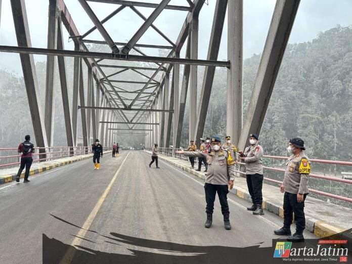 LUMAJANG – Wartajatim.id || Personel Polda Jawa Timur bersama Polres Lumajang melakukan pemantauan dan memberikan himbauan keamanan kepada warga yang melintas di sekitar Jembatan Besuk Koboan, Desa Sumberwuluh, Kecamatan Pronojiwo, Kabupaten Lumajang, Minggu (23/11/2025).
