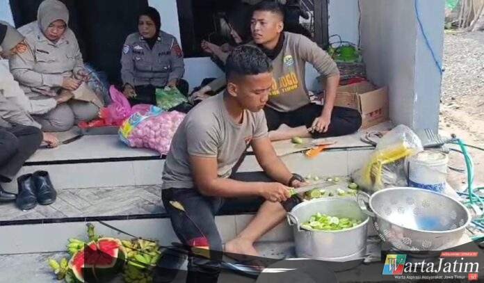 LUMAJANG – Wartajatim.id || Personel Polisi Wanita (Polwan) dan anggota Satbrimob Polda Jawa Timur menyediakan dapur umum bagi warga yang terdampak erupsi Gunung Semeru di Desa Supiturang, Pronojiwo, Kabupaten Lumajang.
