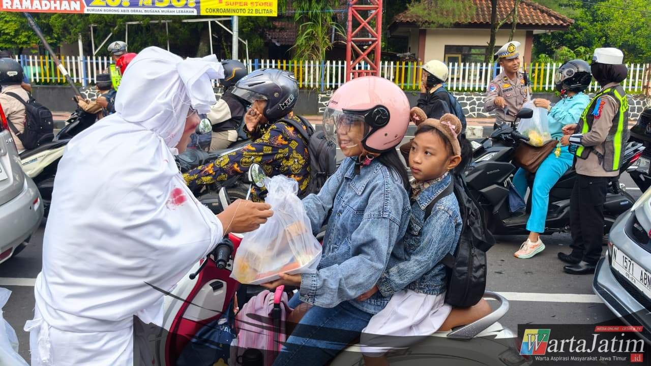 Dalam kegiatan tersebut, petugas membawa replika pocong serta menghadirkan peraga korban kecelakaan lalu lintas penyandang disabilitas untuk menarik perhatian pengguna jalan.
