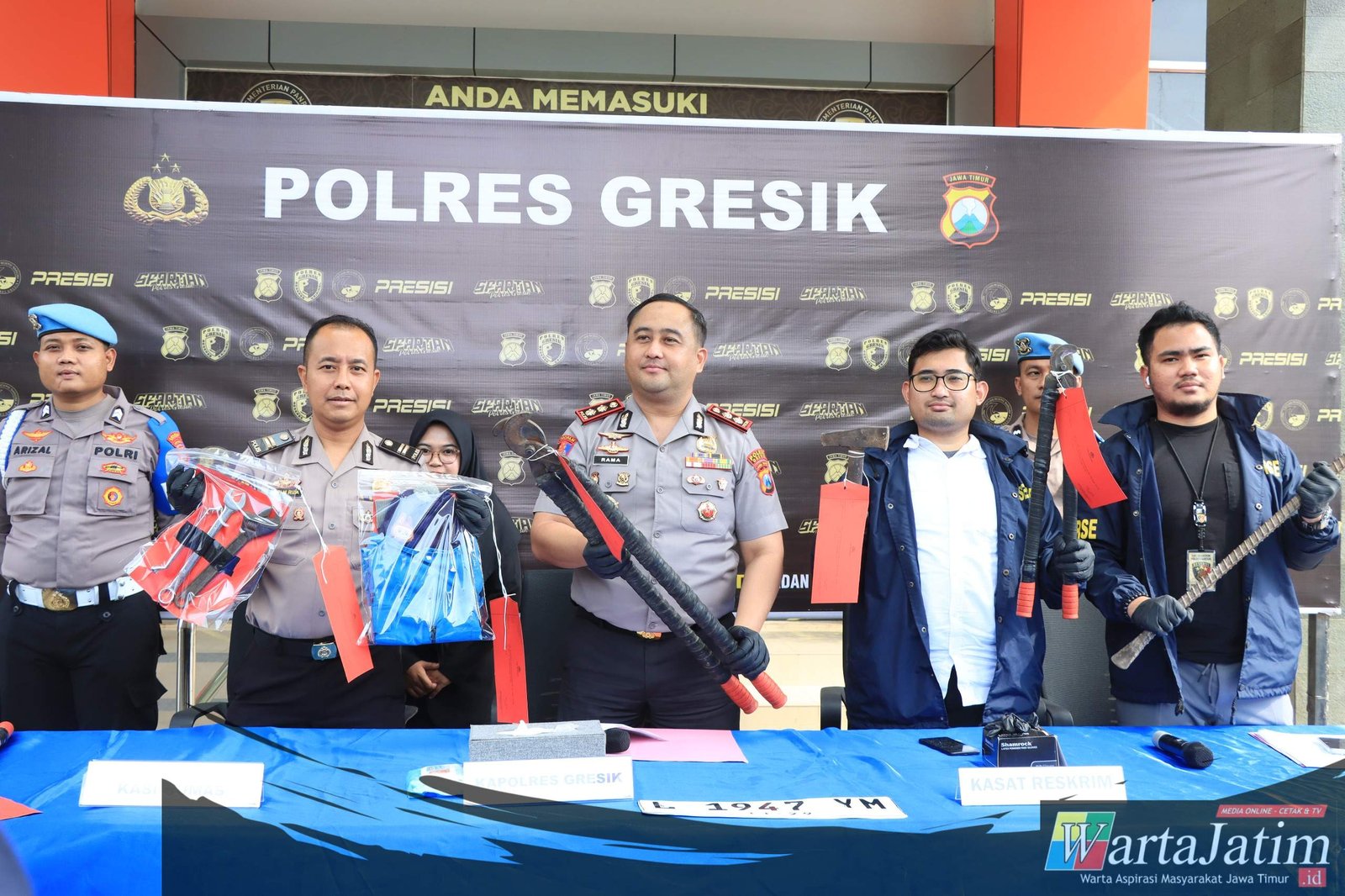 Dalam penangkapan tersebut, Polisi turut mengamankan sejumlah barang bukti, di antaranya tiga gunting besi berukuran besar, linggis, palu besi, kunci pas ring, rompi biru, topi kupluk, karung putih, serta satu plat nomor palsu yang digunakan untuk mengelabui petugas.
